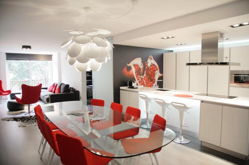 Espacio abierto que llenamos con una cocina abierta con península y panelada con vidrio y un salón comedor bello y confortable.